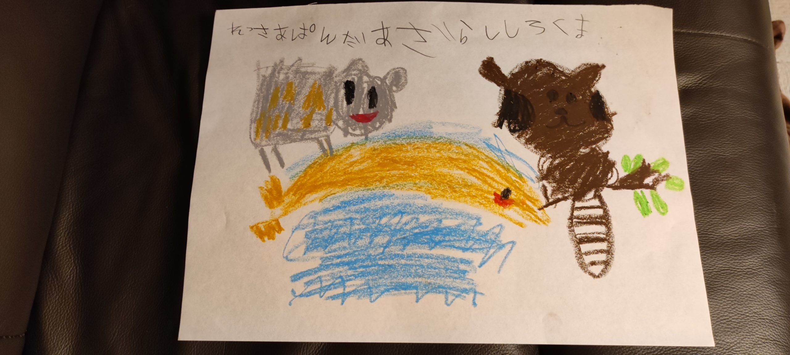 加筆)娘が、絵を描いていました。レッサーパンダ(右)とアザラシ(中央)としろくま(左)らしいです。しろくまの汚れ?まで描いていました^^;