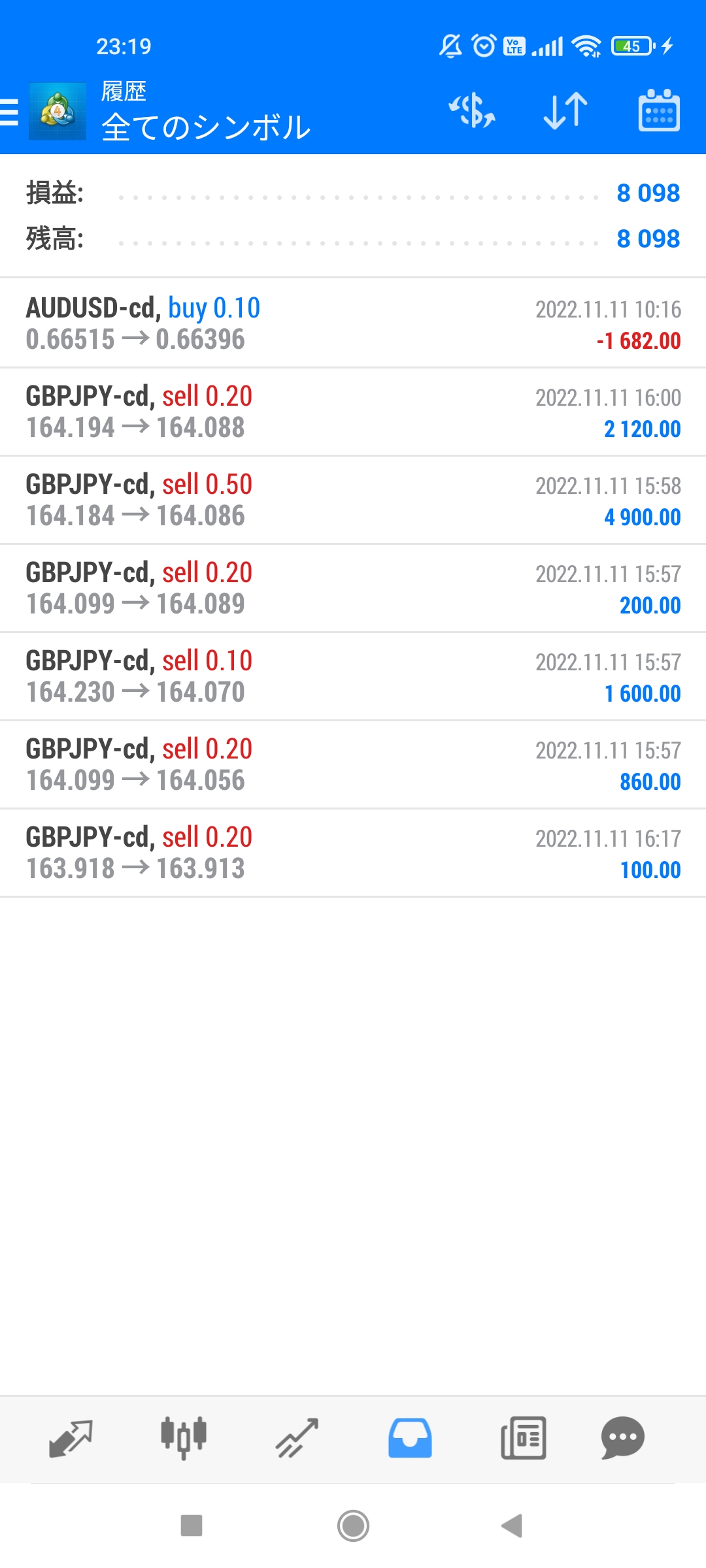 相変わらず、隙間時間でのスマホでのデモトレとその記録です。MT4なので、表示時刻↓には6時間(?)のズレがあります。