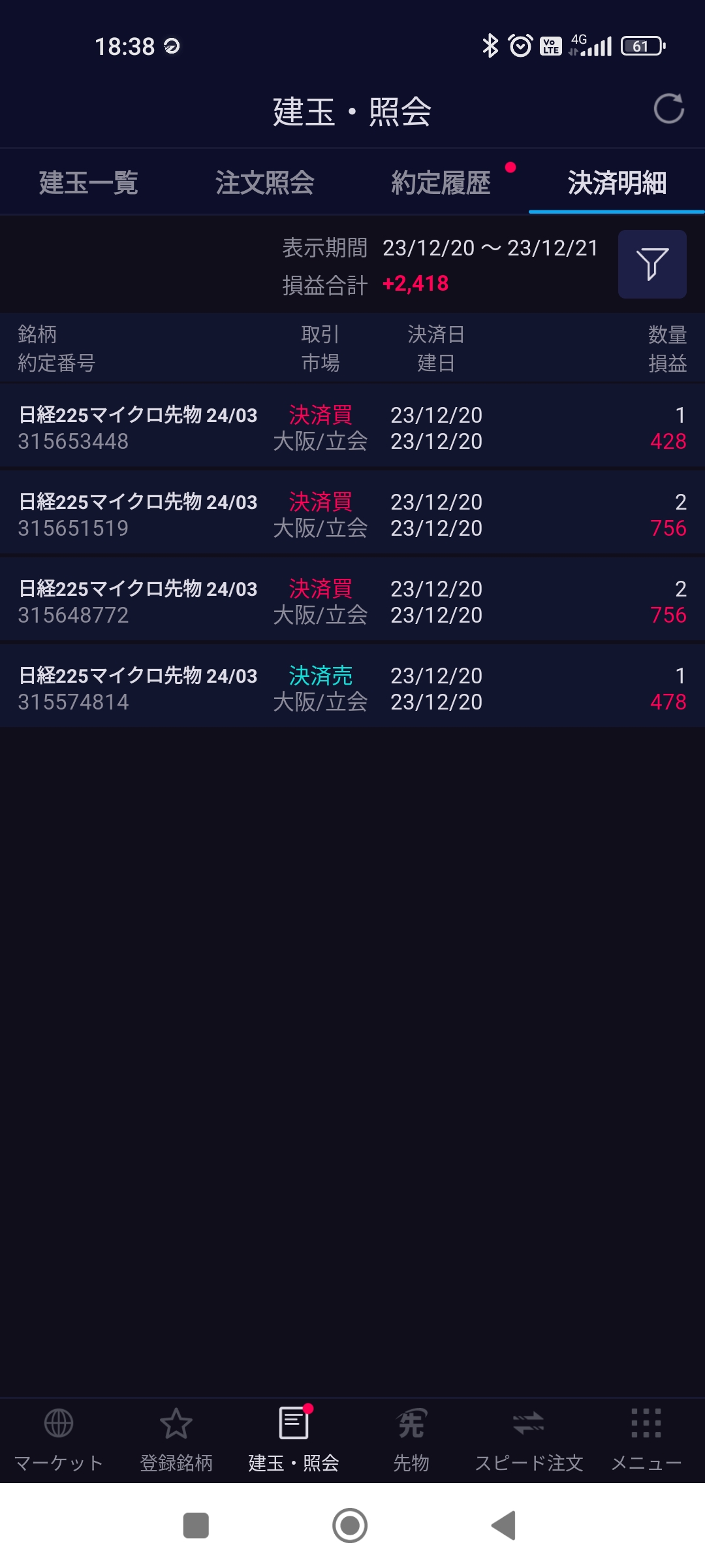 結局、本日の検証トレードはこちら(朝寄り付き1枚、夕方5枚の分割決済)。