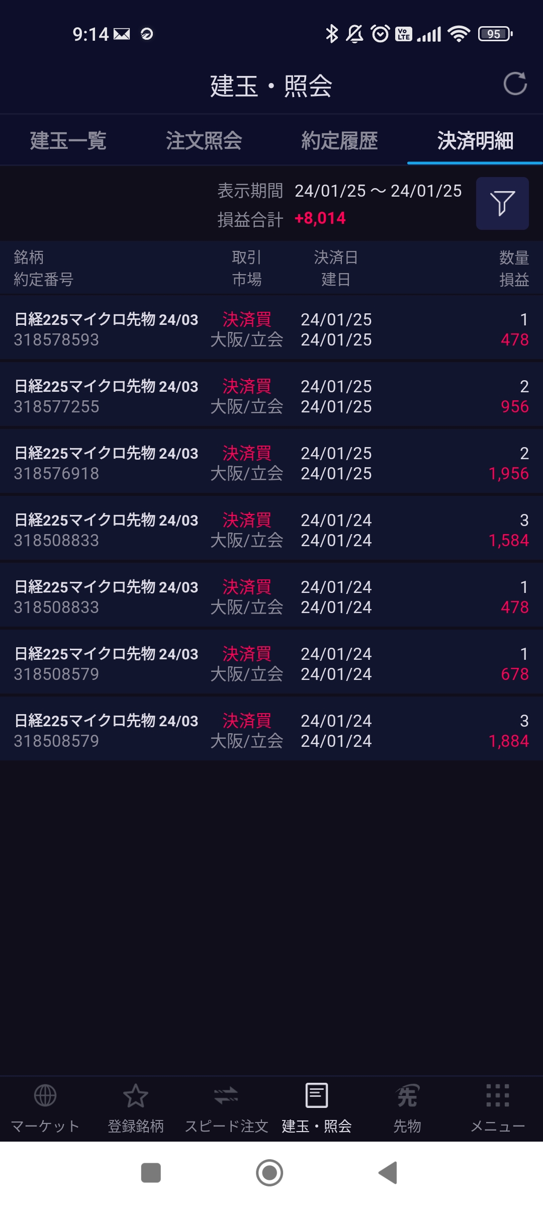 先物練習42 ブログ X Facebook LINE 2024-01-25 今日は、すべき仕事が溜まっていて、短時間にサクッと利確したいところでした。スクショでは、今朝の分は上の3行なので、約3500円のGetと言う感じでしょうか。